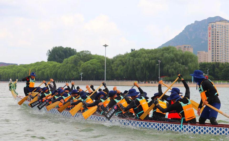 记者在大凌河畔看到,本地组的参赛队伍正在紧锣密鼓地进行训练。河面上,一艘艘龙舟破浪前行,队员们喊着整齐的口号,划桨的动作协调而有力。为了能在比赛中取得佳绩,各队都聘请了专业教练进行指导训练。教练们不仅对队员们的划桨技巧进行精细打磨,还对团队协作、战术布局等方面进行全面优化。队员们在教练的指导下,不断挑战自我,提升体能和技术水平,为即将到来的比赛做好充分准备。